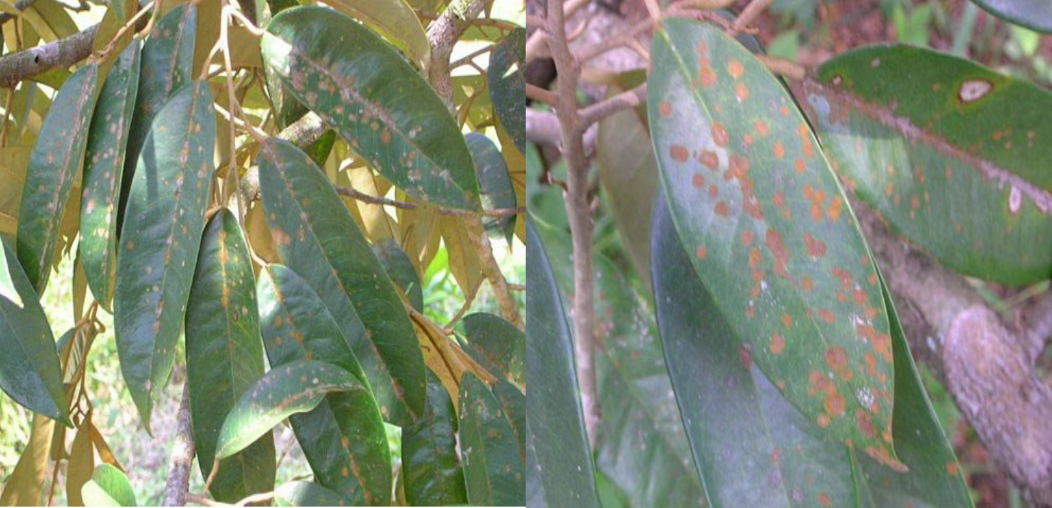 เล็กน้อย ในสภาพที่มีความชื้นสูงและได้รับแสงแดดเพียงพอจุดสาหร่ายจะพัฒนาขยายขนาดขึ้น มีสีคล้ายสีสนิมหรือน้าตาลแดง ลักษณะฟูเป็นขุยคล้ายกามะหยี่ เกิดกระจายทั่วใบ ที่ผิวด้านล่างของใบบริเวณตรงข้ามจุดนูนจะมีสีซีดหากโรคระบาดรุนแรงใบที่มีจุดสาหร่ายมากจะซีดเหลือง และแห้งตาย โรคที่เกิดบนใบไม่ทาให้ทุเรียนเสียหายมากเพียงแต่บังพื้นที่ใบที่ใช้ในการสังเคราะห์แสง ทาให้การสังเคราะห์แสงลดลง นอกจากนี้ยังพบอาการของโรคได้ที่ก้านและกิ่ง หากอาการรุนแรงบริเวณที่ถูกทาลายเปลือกจะแตกและแห้ง ทาให้ให้กิ่งแห้งและทรุดโทรม