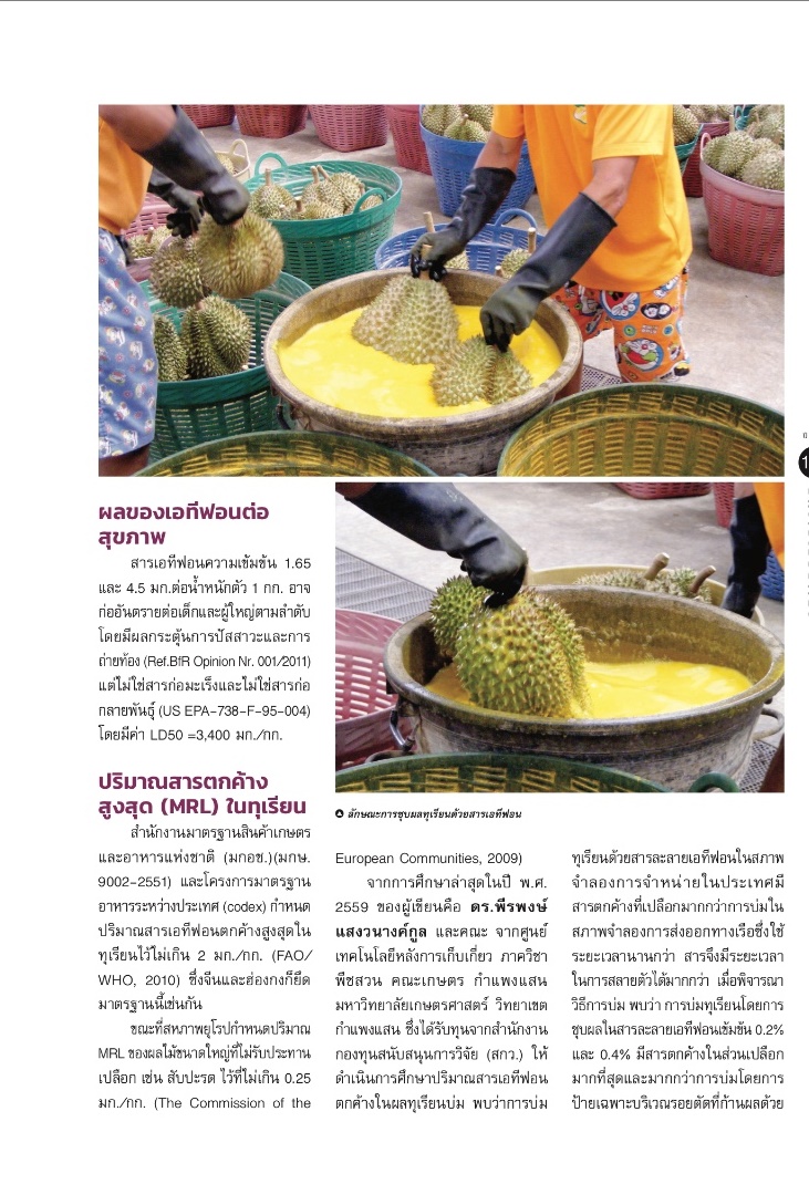 4 สิงหาคม 2561 : เด็กเกษตร ขอแนะนำงานวิจัยดีๆ เกี่ยวกบการบ่ม ทุเรียนด้วยสาร อีทีฟอน ซึ่งงานวิจัย ของ ดร.พีระพงษ์ แสงวนางค์กูล และเพื่อนๆ จากศูนย์วิจัยเทคโนโลยีการเก็บเกี่ยว คณะพืชสวนมหาวิทยาลัยเกษตรศาสตร์ วิทยาเขตกำแพงแสน ซึ่งพบและยืนยันถึงความปลอดภัย ครับ