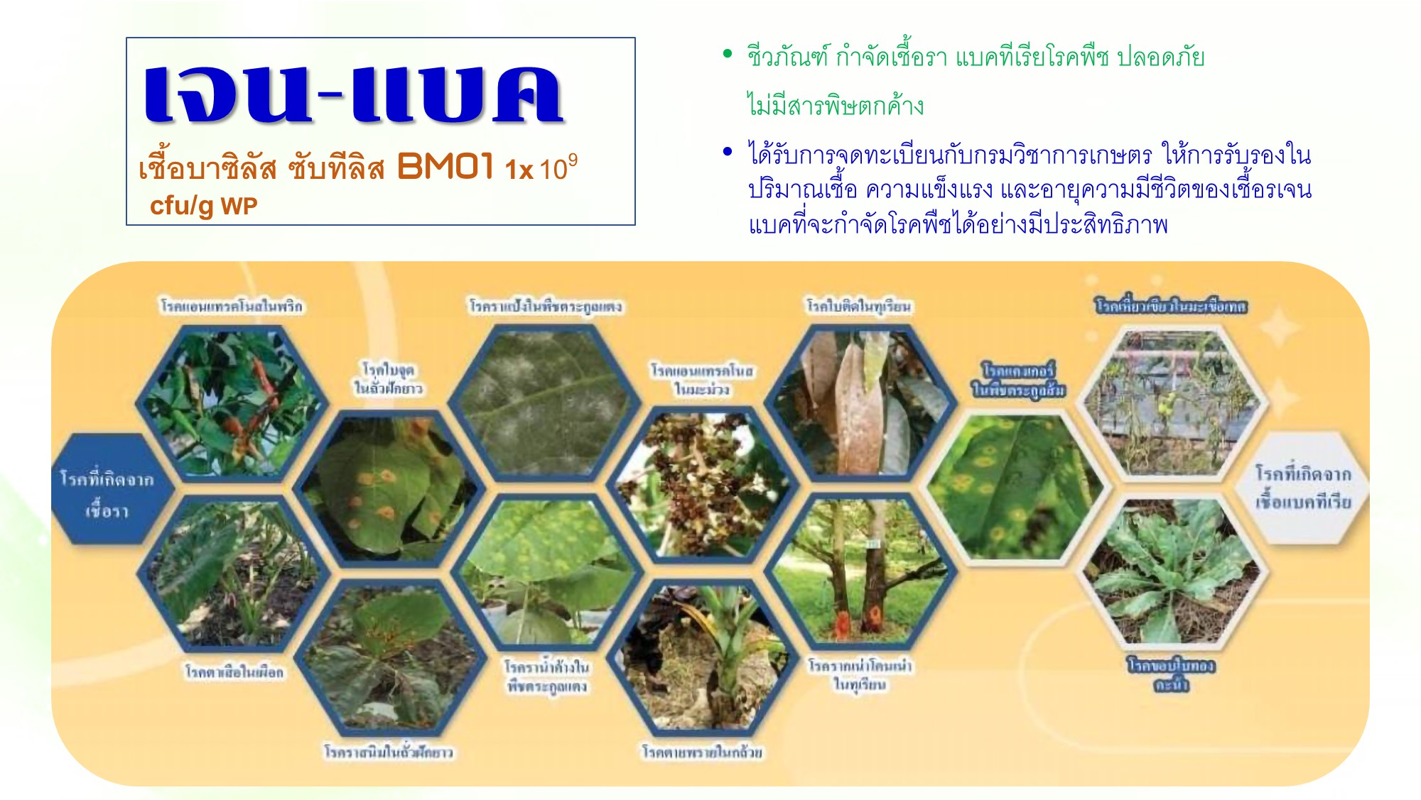 เจน-เเบค[1กก.x2]: สารชีวภัณฑ์แบคทีเรียBS BM-01สามารถควบคุมเชื้อโรคพืช และรักษพืชของท่านที่ถูกเชื้อโรคเข้าทำลายทำความเสียหายเเล้วให้หายฟื้นคืนจนอาการเป็นปรกติ สามารถพ่นหรือป้ายทาไปที่เเผลที่ถูกเชื้อเข้าทำลายโดยตรงเพื่อหยุด ยัยยั้งการขยาย-แพร่ระบาดที่รุนเเรงมากขึ้น ใช้ได้กับพืชทุกกลุ่ม พืชไร่-นา ไม้ผลไม้ยืนต้น พืชผัก-กินใบกินหัว ไม้ดอกไม้ประดับทุกชนิด เจน-แบค คือแบคทีเรียบาซิลัส ซับทิลิส สายพันธุ์ BM-01 สำหรับป้องกันกำจัดโรคพืชจากเชื้อรา และเชื้อแบคทีเรีย ปลอดภัยไร้สารตกค้าง สามารถป้องกันกำจัดและรักษา โรคพืช ราน้ำค้าง ราแป้ง แคงเกอร์ แอนแทรคโนส ใบจุดและใบติดในทุเรียน โรครากเน่าโคนเน่า และโรคขอบใบทอง